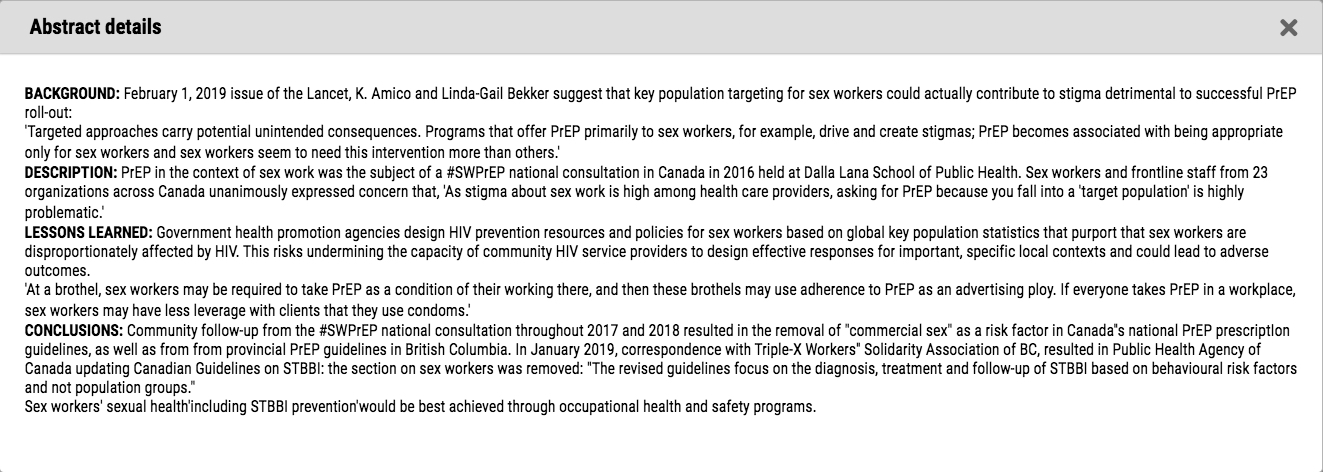 - Community response shifts public health strategies for sex workers in STBBI prevention policies in Canada, 23rd International AIDS Conference 2020, San Francisco , AIDS 2020 Virtual, July 6-10, 2020