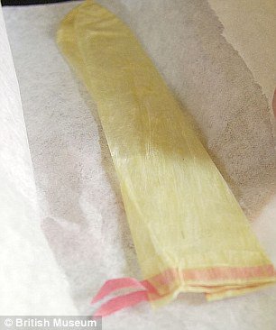 18th century animal-gut condom in the British Museum. This would be rinsed out, soaked in water or milk and reused. The pink ribbon is to tie it on.